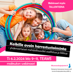 Maksuttomassa webinaarissa tarkastellaan, kuinka tukea lasten ja nuorten moninaisuutta ja yhdenvertaisuuden toteutumista harrasteliikuntaryhmissä. Webinaari antaa tietoa ja käytännönvinkkejä, miten ohjaajana tai toiminnan järjestäjänä huomioit erilaiset liikkujat.