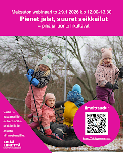 Pienet jalat, suuret seikkailut – piha ja luonto liikuttavat! -maksuton webinaari järjestetään jälleen tammikuussa 2026. Miten piha-alueet ja luonto voivat tukea lasten liikkumista, oppimista ja hyvinvointia? Tule mukaan maksuttomaan webinaariin, jossa sukelletaan ulkoiluympäristöjen merkitykseen tutkimustiedon, käytännön esimerkkien ja tukimateriaalien kautta.